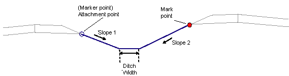 The locations of the attachment point and marked point are determined. The marked point may be either to the right or left of the attachment point. Links are extended inward at Slope 1 from the attachment point, and Slope 2 from the marked point, until they intersect. If a non-zero ditch width is given, a horizontal bottom-of-ditch link is fit into the intersecting side slopes.