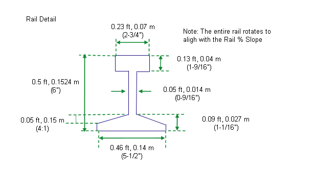 The links for the rails, sleeper, ballast, and sub-ballast are calculated and placed based on the input parameter values provided. If the Rail %Slope is non-zero, the corridor profile elevation is held at the center of the rail on the low side. The finish grade, sleeper, ballast, and sub-ballast links are maintained at the Rail %Slope.
