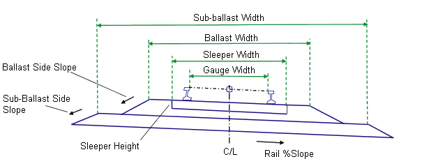 In layout mode, this subassembly displays the links comprising the finish grade, ballast, sub-ballast, and side slopes.