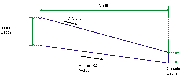 The finish grade of the shape is inserted for the given Width and % Slope outward from the attachment point. The bottom link slope is calculated based on the inside and outside depth of the shape. The point, link, and shape codes are set in the input parameters using the user-defined strings.