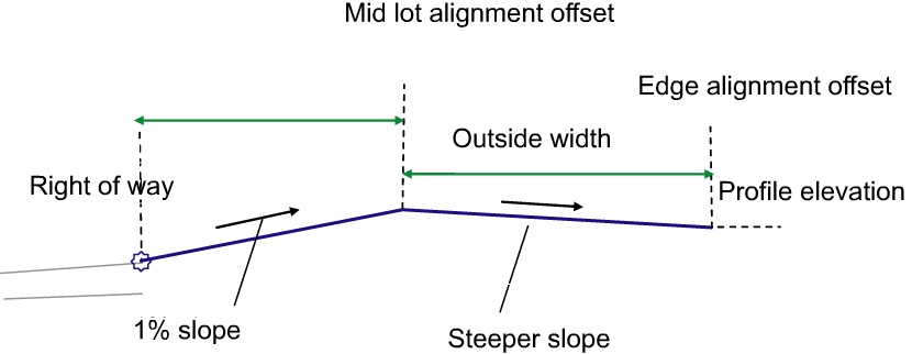 The lot grade assembly tool needs to start at the right of way and, much like the BasicLaneTransition subassembly, it will hold grade and change offset to the middle of the lot at a default slope of 1%. The value of the slope can be input by the user. At the middle of the lot will be an alignment with no profile. So the assembly will be a link from right of way to that mid lot alignment at 1% slope. Then the mid lot alignment will link to the back of lot, which is a fixed elevation; for example, 74.00 feet. We need to maintain a minimum slope of 1% on the back half of the lot as well. Therefore there needs to be a rule in place if the front of the lot grade at 1% slope does not allow for a minimum slope of 1% for the back half of the lot, then the back half of the lot grade needs to change to 1% and the front half lot grade needs to go steeper.