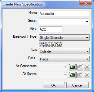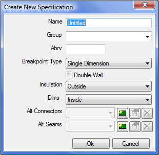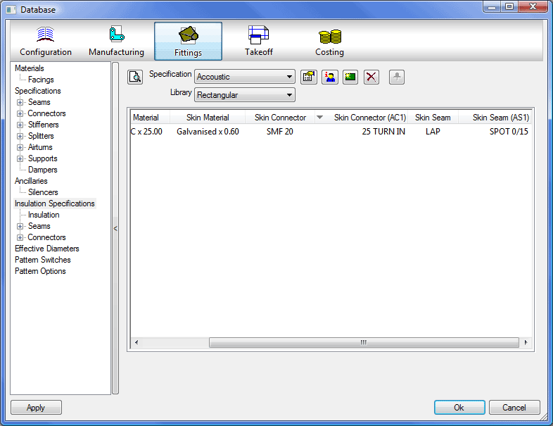 Setting up the specification enables the automatic selection of parameters. Some patterns have the ability to override the specification settings. It is not essential for ductwork users to set up or use specifications. However, when the specification table is correctly set up, adding items to a job takes less time, and is much simpler. Note that before defining the specification, it is necessary to set up the relevant Connector, Seam, and Insulation Material values first.