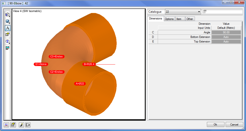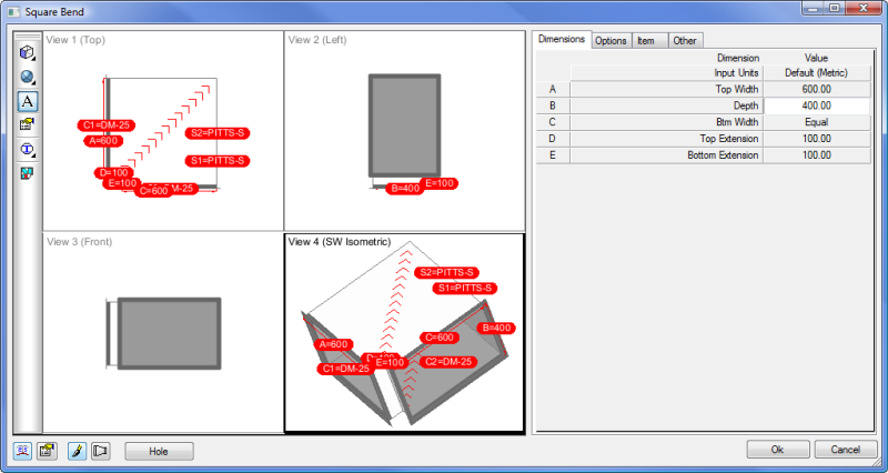 Gives the opportunity to add multiple holes on either of the faces. New parameters will become available in the Dimension/Options tabs to specify size or change offset values. These hole(s) will become visible in the views after application, and they also alter developments by creating inner islands.