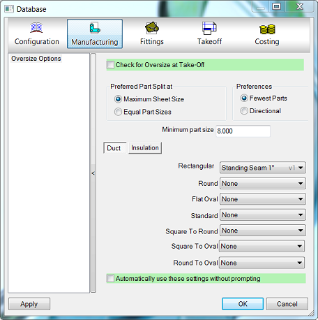 - Carry Over Duct Sizes: This allows the next item entered in estimating to inherit one dimension from the previous entered part.