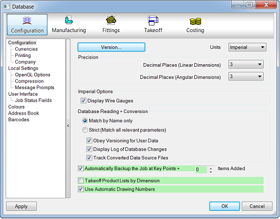 Similarly, when these options are selected in Local Settings, the following options display with a green background on the Configuration Database dialog.