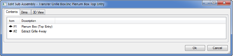 Right-click on a sub assembly to display the Edit Subassembly dialog. This dialog has three tabs: Contents, Dims, and 3D View. Each is described below.