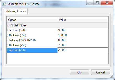 The Check for POA Costs dialog prompts to enter all prices that do not have a price list cost applied, and use the same logic as described above in the Quick Takeoff mechanism. Only one of each size will be listed in the dialog for the price to be applied to all matching items and for the remainder of the quote. The prices specified on this dialog are used.