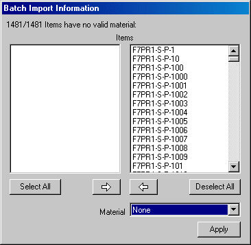 Alternatively use Ctrl+A to select all, and then click Open. The following dialog is displayed. This allows the user to change the material for each of the imported items.
