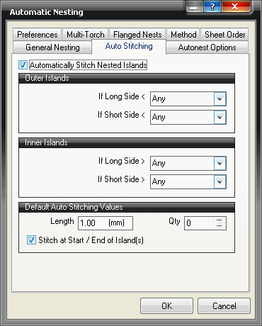 Outer Islands - If Long Side < : This option allows the user to enter a value. If the long side of the part is less than the value entered, the part will be stitched. Alternatively, select Any and the part is stitched irrespective of size.