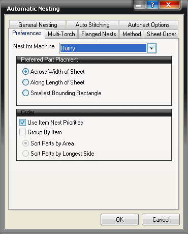 The Preferences tab allows users with more than one cutting machine to determine the preferred machine to nest to. This is necessary because the software can only nest a job in one way. A good example of this would be if a user had two cutting machines; one for galvanised material the other for cutting stainless steel. When the user has entered the job, they would then decide which was the more appropriate machine to nest to. Depending on how the machine has been set up within installed machines, the nest can be accomplished in several ways.