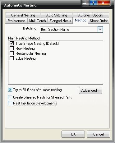 The Method tab specifies which nesting methods are applied. The options govern the general form of the nest.