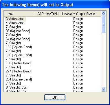 Any Item Status that does not have the Output option checked (enabled) will display the following dialog when creating the CAM output file: