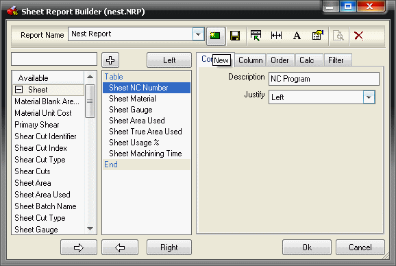 The fields chosen in this example are all from the 'sheet' section - Sheet NC Number,Sheet Material,Sheet Gauge, Sheet Area Used, Sheet True Area Used, and Sheet Usage % as in the image below.