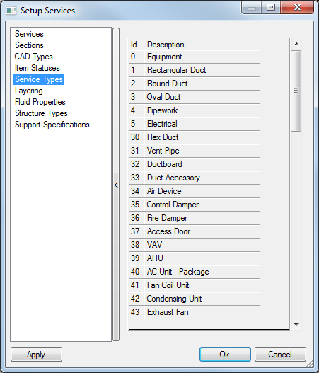 To attain the required layering system, new Service Types can be added and associated with specific product lists. e.g. Pipework product lists (Victaulic, Welded, Plastic, etc), have the Pipework Service Type assigned, but to assign all the Drainage Pipework to a different Service Type, follow the procedure below.