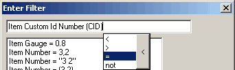 The search can also be made up of multiple filters to allow for greater control; for example, Item Custom Id Number (CID) = 535 and Item Description not Fire Damper Flanged.