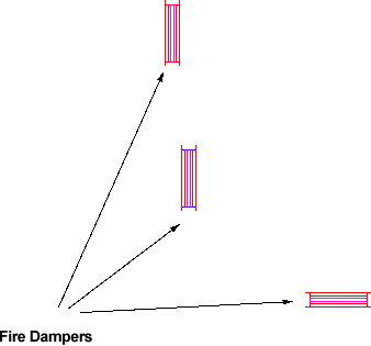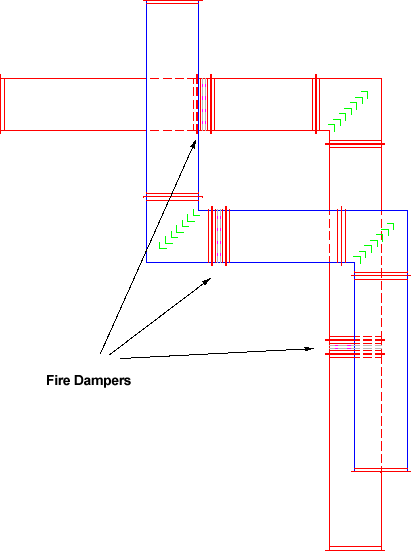 The sample drawing below shows two sets of items on separate services. Each service run contains fire dampers that need to be edited. To select these dampers might be difficult, even on a drawing as simple as this. For this reason, the Search / Filter for Objects command can be used to isolate the dampers from the rest of the drawing.