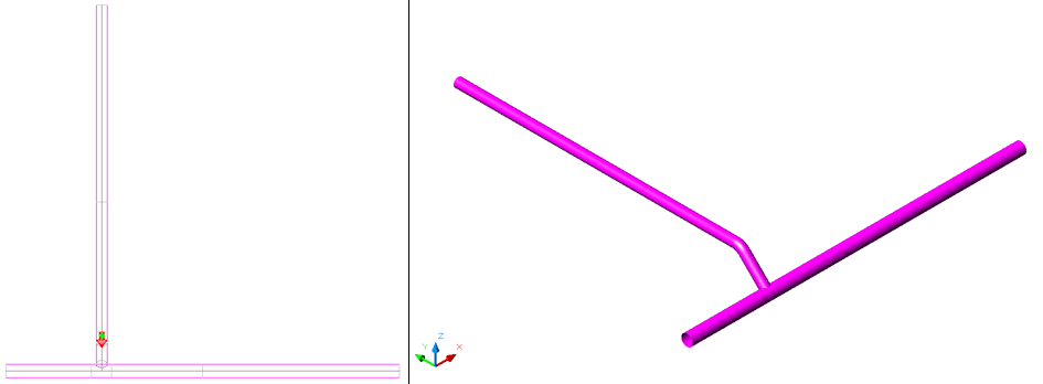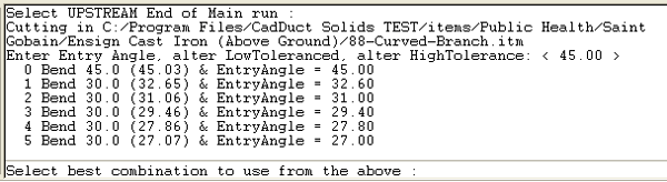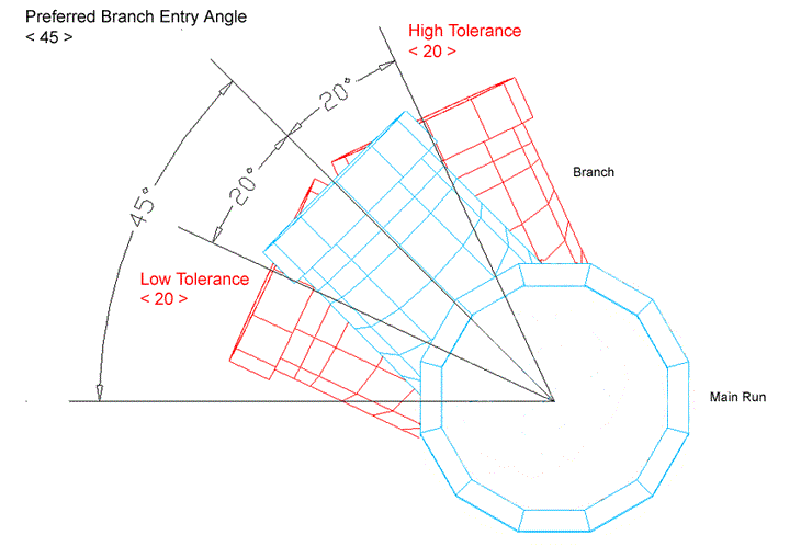Note: The Preferred Branch Entry Angle currently selected is stated in brackets, in this case < 45 > (45 degrees). The LowTolerance & HighTolerance options may be selected and adjusted as necessary by typing LT or HT at the command line when prompted. In the example shown below, the Low & High Tolerance values are set at <20> (20 degrees). CADmep will try to provide a solution for the entered angle and will also try angles between entered angle-LT and entered Angle +HT; i.e. rotation angles for the swept branch of between 25 to 65 degrees.
