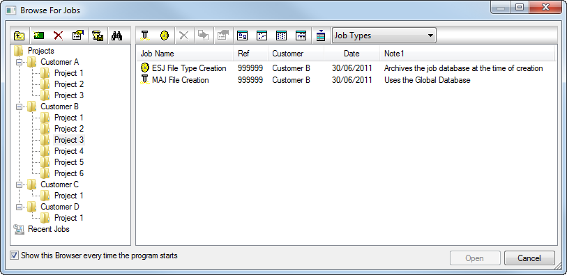 In ESTmep and CAMduct, the Job Browser dialog provides a global view of all projects stored within the Autodesk Fabrication product's Projects folder. The Job Browser can be used to organise jobs/quotations in the preferred format; for example, by alphabetical project names (Customer Name) or by year/month date order. The dialog provides quick access to previously entered jobs/quotes or the ability to create new ones.