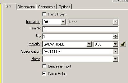 When taking off or editing a fitting, the use of tabs is determined by the Castle Holes option on the Item tab of the Takeoff dialog. When the Castle Holes option is checked (enabled), the tabs are included. When the Castle Holes tab is not checked (disabled), the tabs are not included.