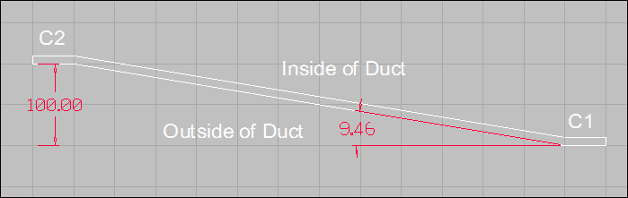 On the label, it says Break C2 Up 100.00 or Break C2 Up 9<, depending on how you have set up the label. This means that the C2 end of the duct must end up 100mm above C1, or 9 degrees above C1, as shown in the illustration below. This illustration displays the angle as 9.46 which is the true angle size. The information on the label has been rounded.