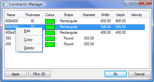In CADmep, the Constraints Manager allows quick access to all constraints in the active Design Line. You can select alternative values/settings for the Constraint and Fill in 3D when required. When new values are specified, all instances of the current constraints in the drawing are updated with the new values/settings. Access the Constraints Manager by clicking the fly out toolbar for Design Line and clicking on