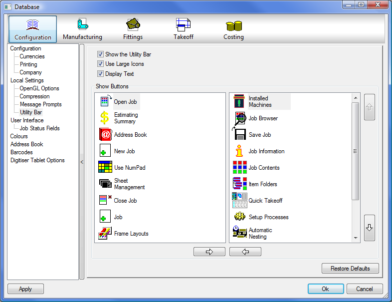 The Utility Bar can be dragged and placed anywhere on the screen, docked along any side of the application window, or hidden. You can also customize a variety of display options on the Utility Bar, such as selecting which icons are displayed or not, and displaying or not displaying the title text next to the button image. To customize the Utility Bar, right-click in the Utility Bar and select Customize. This displays the Database dialog, presenting a variety of options for customizing the Utility Bar.