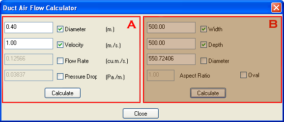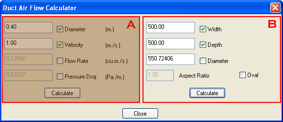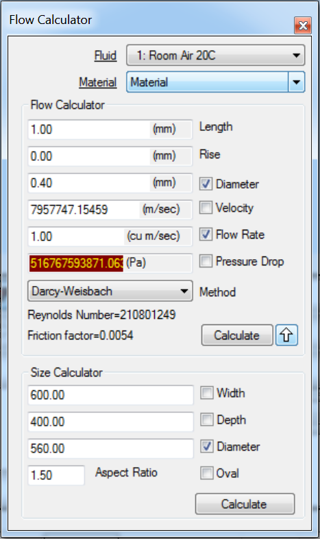 The Flow Size Calculator feature lets you calculate equivalent round/oval rectangular width/depth sizes based on a variety of parameters. Additionally, any two from the following list of parameters can be input, and the remaining two properties can then be calculated: