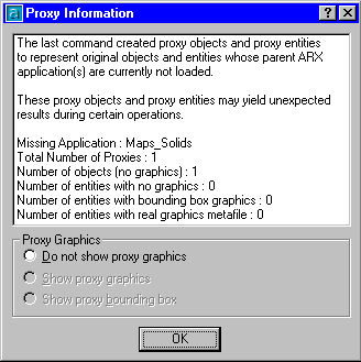 The Proxy Information dialog indicates that there are custom objects in the drawing that require an object enabler to be installed before you can access the objects in that application.