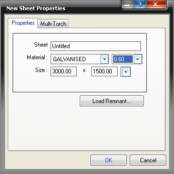 New: Creates a new sheet to the default sheet size. This sheet will be the same material and gauge as that selected above.