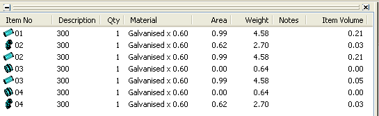 Clicking the Display Job Contents View button on the CADmep toolbar displays the Job Content view. This view displays a detailed list view of all the items, connectors, and specifications in the current drawing. An example of the Job Contents view is shown below.
