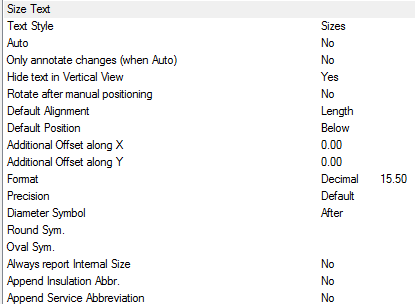 Only annotate changes (when Auto): Only applies a Size label when the items are different in size or cross section from the previous item connected from. The Auto option must be set to Yes to utilise the Only annotate changes (when Auto) option.