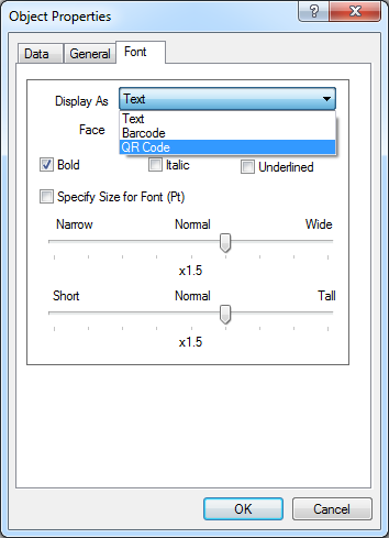 Note: If Human Readable data is to be displayed, an appropriate font may be selected from the Face drop-down menu. The selected font may also be underlined, italicized and bolded by clicking the relevant check box. The settings for Narrow - Normal - Wide and Short - Normal - Tall will affect both the human readable and the bar code and QR code display properties.