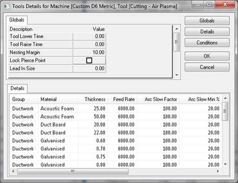 This dialog details the specific tool settings for all combinations of material and gauge that exist on your database. Some of the settings apply globally (for example, the "Pierce Size") whereas others differ with each material and gauge (for example, "Feed Rate"). For more information on these setting, Tool Settings.