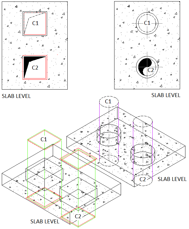 The following example illustrates a duct ventilation rectangular and spiral straight item passing through a structural slab level.