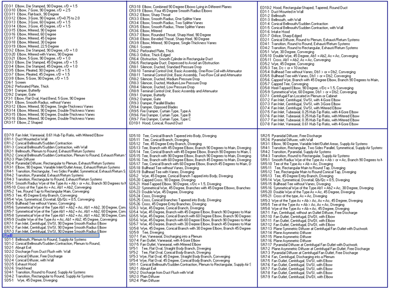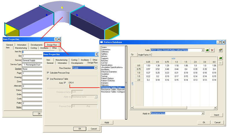 Historically, the Fabrication product software has been linked to ASHRAE tables that determine the additional resistance (K value) to flow introduced by standard rectangular and round fittings. Many of the existing duct fittings are linked to the appropriate table information through hard coded conditions. For example, a Rectangular Radius Elbow is dynamically linked to table CR3-3 if splitters are used, and to table CR3-1 if splitters are not used.