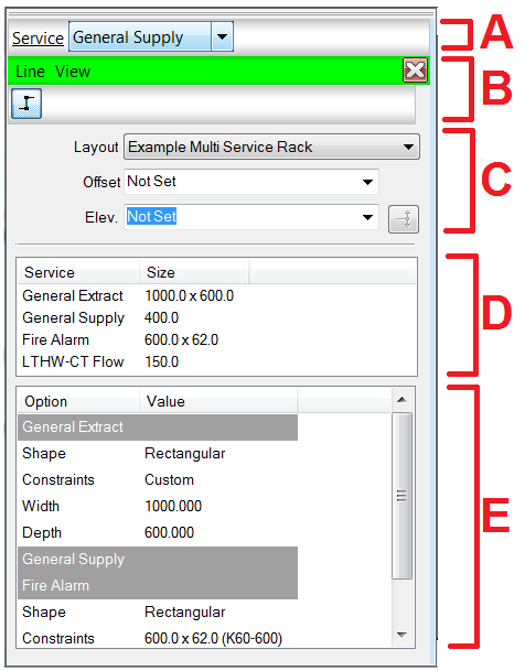 C: Frame, Elevation, Offset Settings - This section of the Multi-Service Line dialog lets you specify a frame layout, offset and elevation.
