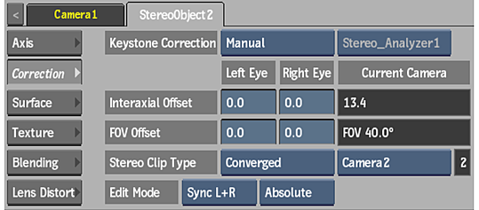 Use the Correction tab of the Stereo Object menu to indicate how the footage was shot, and make interaxial offset and FOV offset adjustments to the left/right images.
