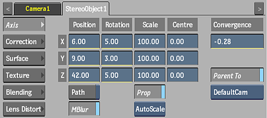 The Position, Rotation, Scale, and Centre settings are the same as in the Axis menu. The following Axis settings are specific to the Stereo Object: