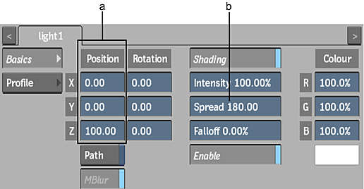 - Adjust the spread and position of the light source in the Light menu. Use the Spread field to set the spread of the particle stream. The Intensity, Falloff, and Colour fields are not used by the particle generator.
