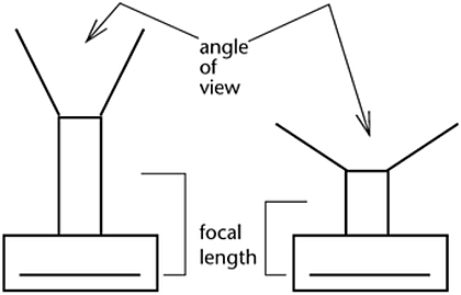The angle of view and the focal length are inversely proportional. As you extend the camera's focal length, the field of view gets narrower. As you shorten the focal length, the field of view gets larger.