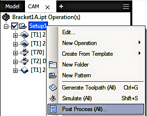 You can Post Process for any single toolpath or any combination of toolpaths. To select all toolpaths, click on Setup in the Browser. After selecting the toolpaths, you can right click over the operations and select Post Process. You can also access it by pulling down the Actions panel.