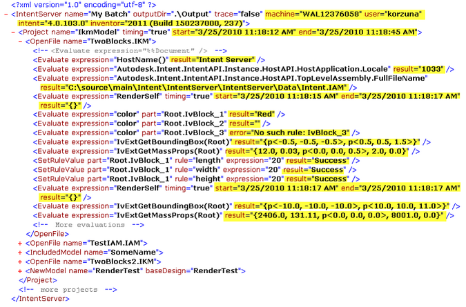 The XML root element is <IntentServer >. The children element, <Project > specifies the Inventor project contexts in which the model runs.