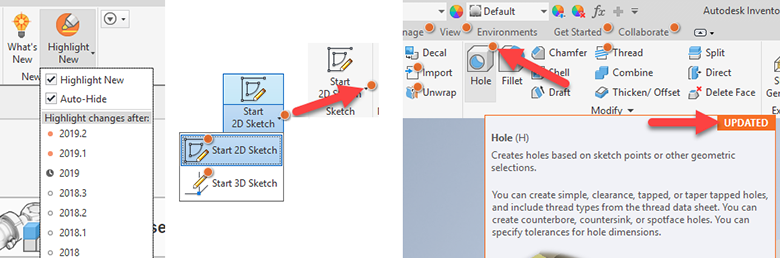 The Auto-Hide option turns off the badge display after first use of the command. This makes it possible to work through the new or updated commands and know which ones you have not used or explored. Turn off Auto-Hide to constantly display the badges.