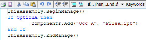 In the following example, OptionA is a True/False parameter in the assembly. If the parameter is set to True, the component named Occ A will be added or updated. If it is False, the component won't be added or it will be deleted. iLogic ensures that Occ A is present if-and-only-if OptionA is True.