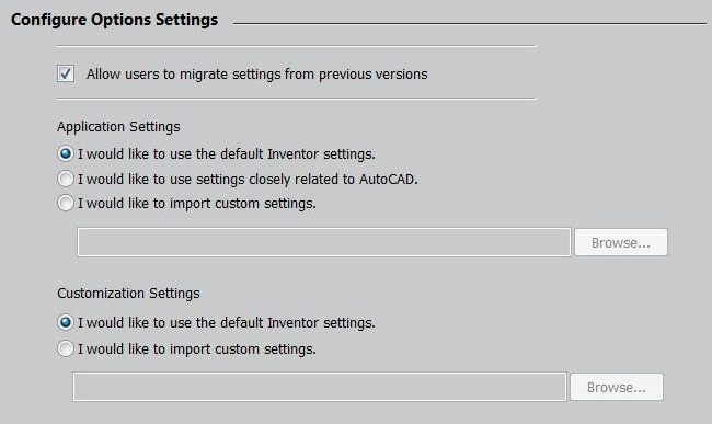 If an older supported version is detected when you install Inventor 2019, the Migrate Custom Settings dialog appears. Use this dialog to update Inventor with your customization and Application Option settings without the need to use the xml export/import process.