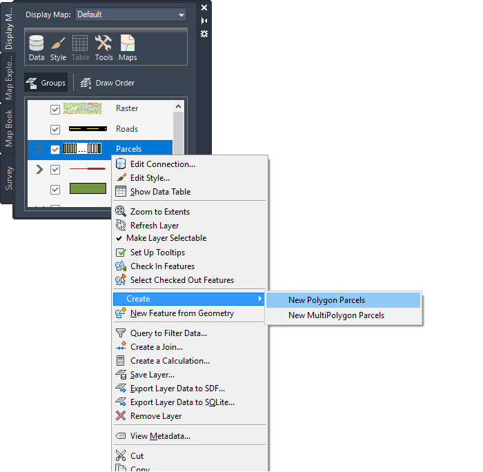 Each item in AutoCAD Map 3D toolset has a custom menu that contains commands available for that item at the current time.