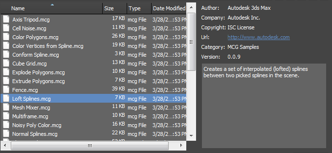 A MAXScript file (.ms) is created to view the MCG plugin's boostrapping code. The rollout portion of this graph can be copied into the Custom UI tab of the Graph Properties to fine-tune the layout of the tool's user interface. For more information on customizing the rollout, see here.