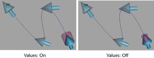Values option in its settings menu allows you to copy all identically named attributes from the source to the target. In the following example, the scale attribute is copied from the arrow to the cylinder when