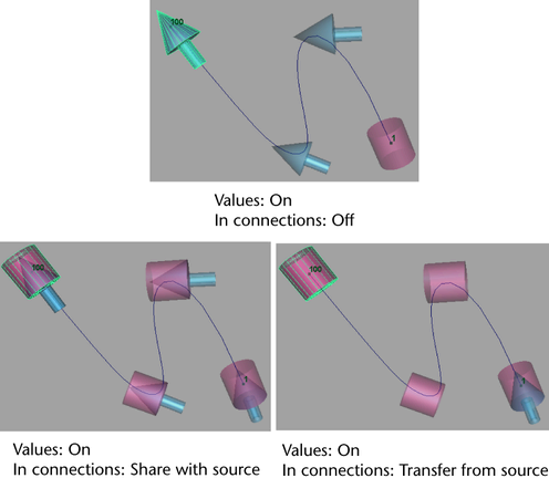 In connections option allows you to duplicate or transfer all incoming connections from the source node to the target node. This is useful for copying or transferring animation from one object to another respectively. You can see the differences in the following example: