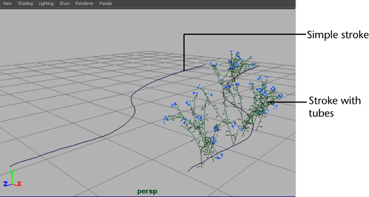 When you paint in the scene view, simple strokes display as curves. Strokes with tubes display as wireframe representations of the rendered stroke. Paint is not applied to the strokes until you do a post-process render, which makes painting in the scene view very quick. It provides immediate feedback in enough detail to see what you’re doing. To improve redraw speed, you can adjust the display quality of the wireframe strokes, just as you can adjust the display quality of objects displayed as wireframe.